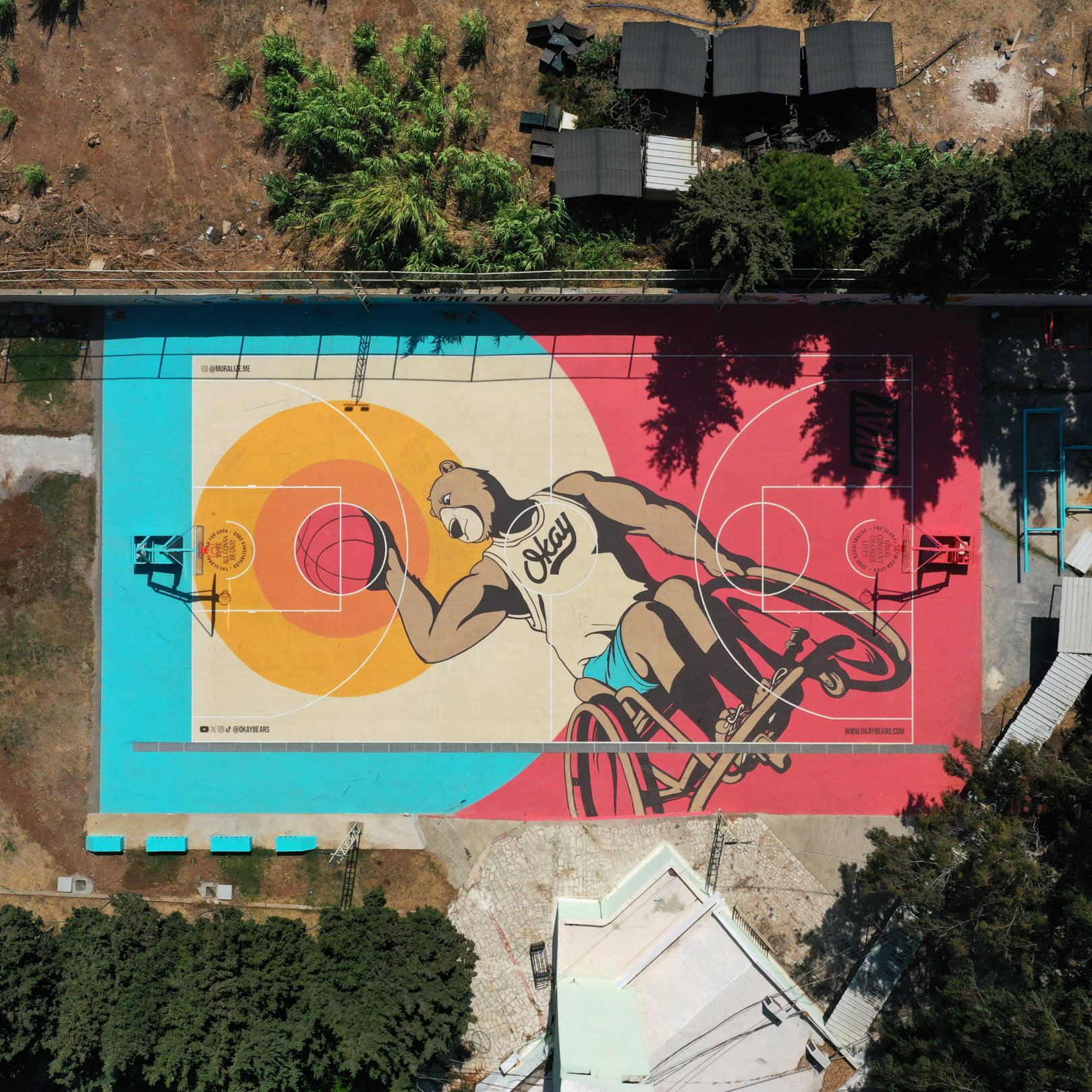 We’ve raised over $100,000 for causes like UNHCR, Movember, British Red Cross, and Children's Medical Research Institute. With partners like (RED) and Lonzo Ball, we’ve connected art, apparel, and digital culture with global causes, creating initiatives that matter. Today, our focus is on transforming public spaces—turning under-resourced basketball courts and playgrounds into vibrant Okay murals that bring hope, play, and pride back to communities.